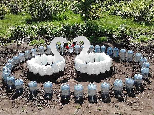 Клумба-лебедь из бутылок