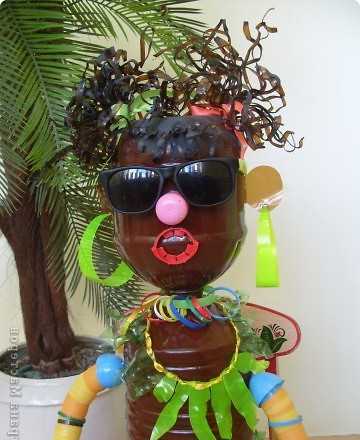 Если с животными вы уже освоились, пойдем дальше и попробуем сделать что-то более сложно, например, фигурки человека из бутылок. Например, посмотрите, какой милый негритенок получился из коричневых бутылок, и как просто его при это сделать: