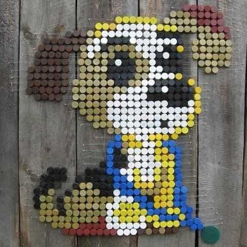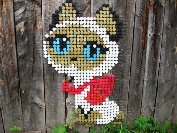А сделать это очень просто — из разноцветных пробок мы с вами будем выкладывать мозайку. Это могут быть животные — ниже есть готовая схема для кошки и собаки, цветы или любой другой рисунок, который придет вам с голову. Или же можно выложить целое панно, как на фото выше. Конечно, для этого понадобится немалое количество пробок. Но плюс в том, что можно использовать готовые схемы для вышивок, чтобы подсчитать, сколько именно пробок вам понадобится и каких цветов. Украшать панно и мозаикой из пробок от бутылок на даче можно стены дома, пространство вокруг окон, забор, сарай и любую другой горизонтальную и вертикальную поверхность. Например, почему бы не сделать из пробок придверный коврик?