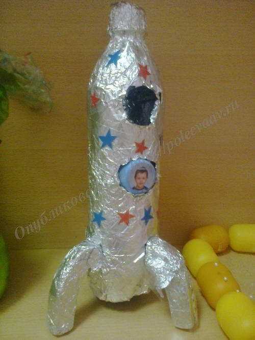 А чтобы ранец стал больше похож на ракету, к горлышкам бутылок нужно приклеить бумажные или тряпочные языки пламени.