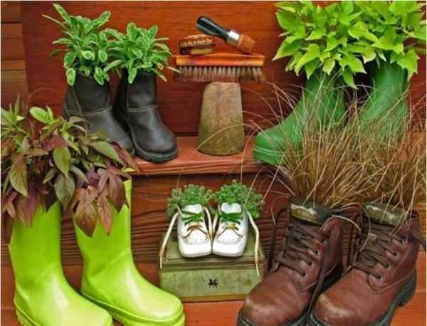 Идеи для дачи своими руками из ненужных вещей, фотоПрактически каждая семья имеет в своих закромах какую-нибудь старую, отжившую свой век обувь, которая где-нибудь лежит себе в мешках — далеко в кладовой дома или квартиры, и о ней уже мало кто и помнит из членов семьи. А может быть, даже у кого-то сохранились маленькие детские туфельки или сапожки, которые давно стали малы подросшим ребятишкам.