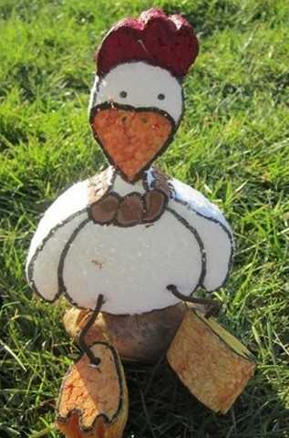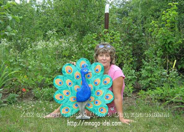 Красивый яркий павлин превосходно впишется в дизайн любого сада или дачного участка. В данном случае он изготавливается по тому же принципу, что и предыдущие поделки. Особенность в том, что для формы тела используется объемный кусок пенопласта, а для создания хвоста — плоский. Далее хвост прочно фиксируется к туловищу, наносится шпатлевка в 3 слоя, шлифуется, раскрашивается краской и покрывается акриловым лаком. Павлин готов украсить дачный участок.