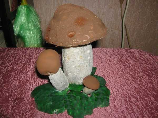 Птица для декора дерева, выполненная из плоского куска пенопластаПоделка из пенопласта в виде грибочков для декора сада