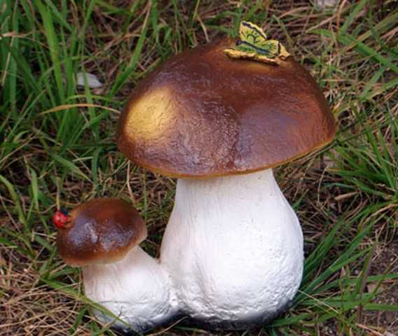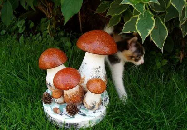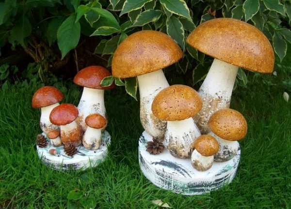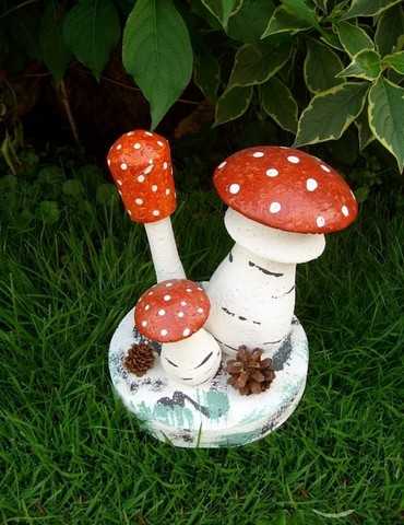 Такие поделки пользуются особой популярностью. Это может быть как достаточно большой и объемный гриб с глазками, носиком и ротиком, который займет отдельное место на дачном участке, так и много маленьких грибочков, которые будут украшать клумбы или места под деревьями. В данном случае из пенопласта вырезается объемная фигурка грибочка. Можно также шляпку вырезать отдельно от ножки и затем зафиксировать шпатлевкой при помощи зубочистки или саморезов, если гриб большой. Для дальнейшей покраски можно применить акриловую краску, используя необходимый цвет посредством колера. Готовые грибочки покрываются масляным лаком во избежание разрушения пенопласта.