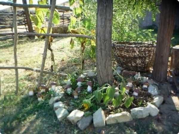 В этом направлении самым распространенным можно назвать украшение старых пней. Дело в том, что выкорчевать пень достаточно тяжело, а на границе участка такая работа вообще не имеет смысла, поэтому проще закрепить сверху не нужный тазик и покрасить. Тем самым превратив пень в оригинальный гриб.