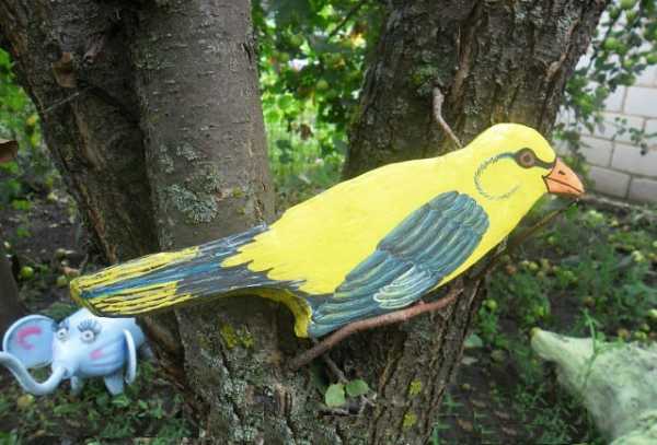 Поделка из пенопласта в виде кошки для декора дачного участкаПоделка из пенопласта в виде птицы для украшения деревьев на даче