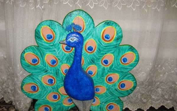 Павлин — хвост сделан из тонкого пенопласта, а туловище из толстого пенопласта. Вырезаем, шлифуем, покрываем шпаклевкой, красим и покрываем лаком.