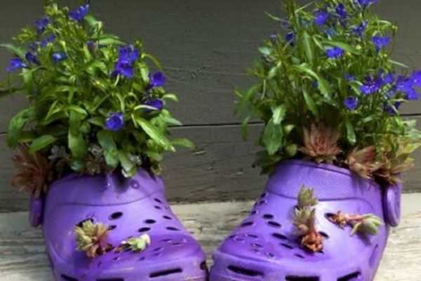 Старые сапоги или ботинки так же станут маленькими клумбами для цветов. Такие небольшие клумбочки, подвешенные на заборе, установленные на веранде или ступеньках, не только украсят участок, но и поднимут настроение хозяевам дачи и их гостям. Другие идеи клумбы из старых вещей.