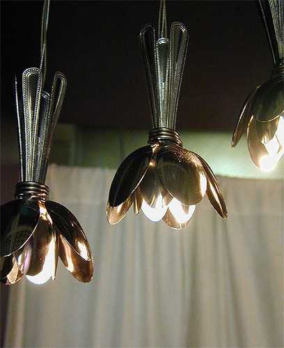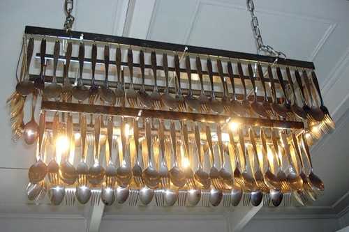Старыми столовыми приборами можно украсить каркас светильника, потолочной люстры или абажур торшера.