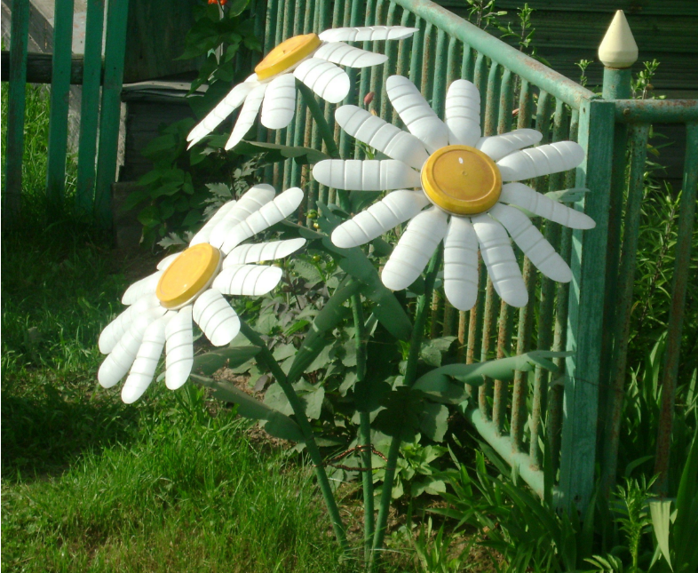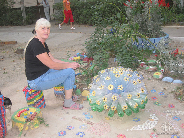 Из пластиковых бутылок делают цветы, для этого у бутылок фигурно вырезают донышки, из зеленого пластика формируют стебель. Если правильно подобрать цвета, можно даже обойтись без краски. Из бутылок побольше получаются фигурки животных, пластик можно использовать в комбинации с деревом и покрышками.