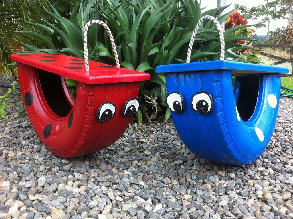 Этот материал гибкий, относительно безопасный, легко красится. Помимо классических лебедей, из шин в комбинации с деревом можно сделать фигурки жирафа и зебры, змею и гусеницу (для этого необходимо несколько покрышек) и даже черепаху.