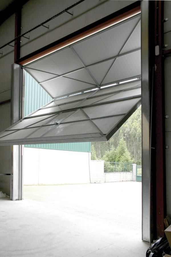 Щит ворот состоит из сэндвича панелей высотой 450-625 мм, скрепленных между собой петлями и при помощи пружинного механизма и направляющих с роликовыми опорами открываются в верх по радиусу.