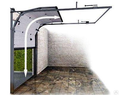 Работает такая система просто: с помощью рычагов, приводится в движение шарнирный механизм с пружинами, благодаря которому и происходит движение створки по направляющим, с последующей фиксацией в верхней точке. Нижняя часть ворот при этом, находится под потолком в виде своеобразного козырька.