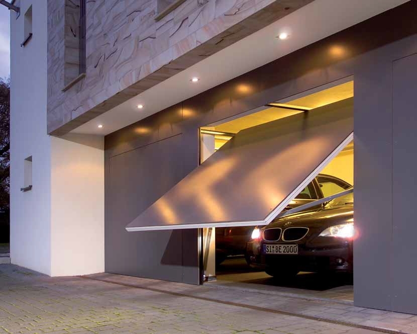 1) Подъемно – поворотные ворота. Цельная створка ворот, благодаря работе шарнирно – рычажного механизма, поднимается под потолок гаража, и таким же образом опускается.