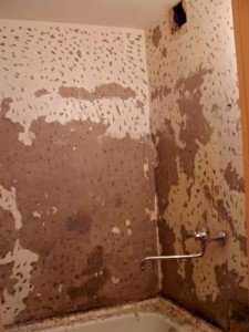 Стены со слоем старого штукатурного покрытия необходимо тщательно рассмотреть и проверить на наличие рыхлых участков. Присутствие участков, на которых наблюдается плохое сцепление с поверхностью, легко определить путем простукивания и выявления в таких местах звона. Участки старой штукатурки отделяются с помощью шпателя, шлифовальной машины, перфоратора, молотка, зубила. Рыхлые участки старого слоя могут быть загрунтованы укрепляющей проникающей грунтовкой, состоящей из извести, кварцевого песка и воды.