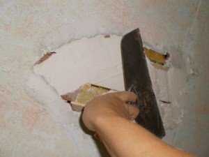 - Простучите старую штукатурку деревянной киянкой для выявления плохо держащихся участков и очистите эти места от штукатурки до основания.