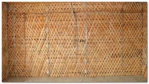 Простильная дрань состоит из кривых, узких и тонких реек. Ее ширина не менее 3 мм. Дрань набивают под углом в 45º относительно плоскости пола и с шагом реек около 45х45 мм для стен, а для потолков 40х40 мм. Ее лишь слегка прибивают гвоздями, чтобы она не упала. Длина гвоздей 25-40 мм, диаметр 1,6-2 мм. Эти гвозди будут вытаскиваться после прибивания выходной драни.