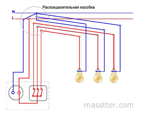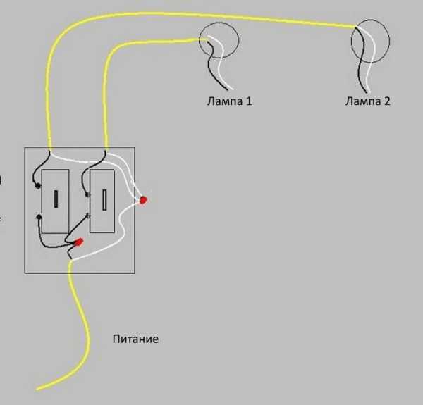 Обратите внимание! Если используется двух- или трехклавишный выключатель, то от выводов выключателя провода подключаются к соответствующим светильникам. В остальном схема подключения идентична.