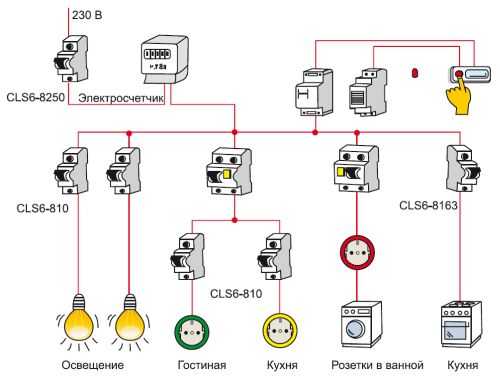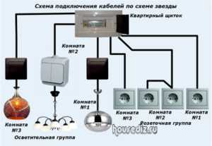 Этот метод позволяет подключить розетки и выключатели по принципам схемы звезды, но экономит место внутри квартирного щитка за счет комплектования потребителей на группы с учетом выполнения ими определенных функций и места расположения внутри квартиры или комнаты.