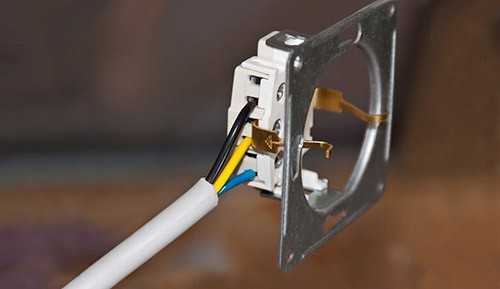 - Для подключения розетки нам следует использовать трехжильный провод. В котором одна жила (желто-зеленая) предназначена для выполнения защитного заземления. Одна жила (синяя) предназначена для подключения нулевого контакта и последняя (любого цвета) — для подключения фазного контакта.