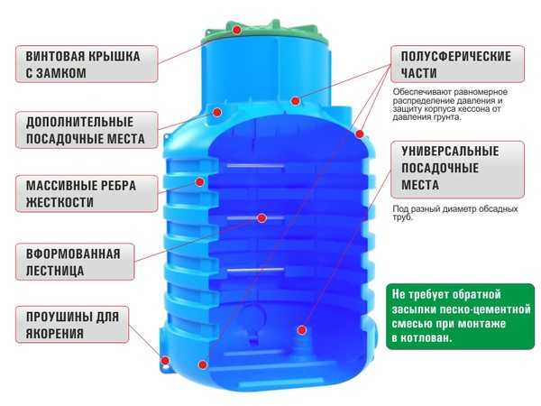 • В настоящее время профессиональные мастера предпочитают использовать пластиковые кессоны, которые продаются в специализированных магазинах. Их просто помещают в яму в соответствии руководством по эксплуатации, а дно для надежности заливают бетоном с жидким стеклом. При этом цена таких систем невысока, а простота их монтажа также сказывается на стоимости работ.