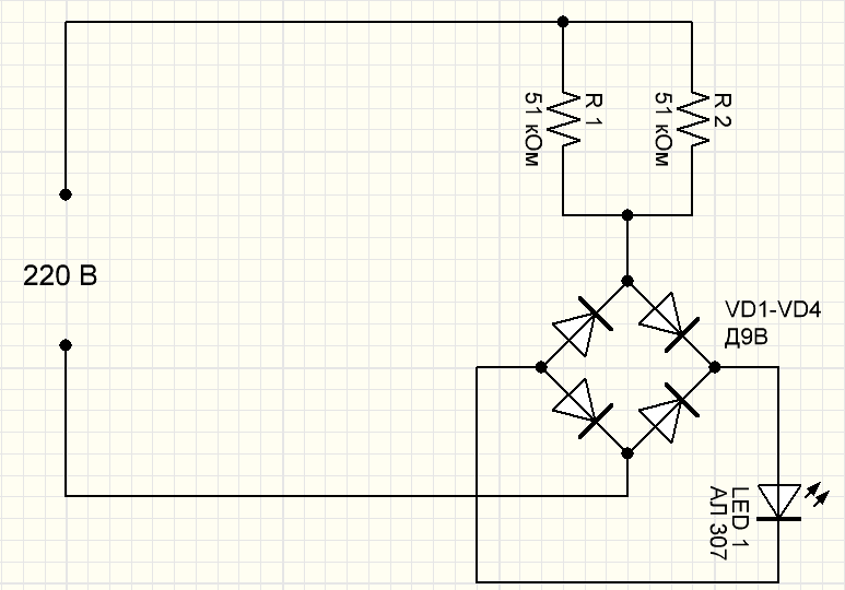 Схема — подключение светодиода к сети 220 В при помощи резистора и диода
