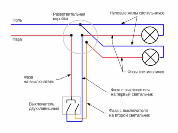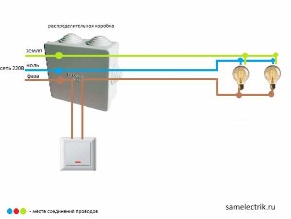 - жила от выходящего контакта выключателя соединяется с двумя фазными жилами лампочек.