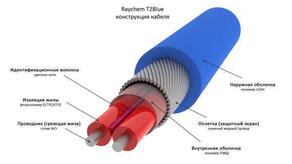 Кабель для нагрева труб состоит из холодного (электрического), горячего (нагревательного) проводников, термоограничителя и штепсельной вилки. Проводники соединены друг с другом лазерной спайкой.
