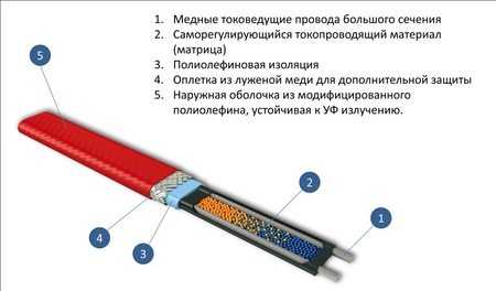 Благодаря этому саморегулирующийся кабель может без помощи человека адаптироваться к изменениям температуры воды. Причем отдельные участки шнура регулируются автономно: где холоднее, там мощность выше, где теплее — там ниже.