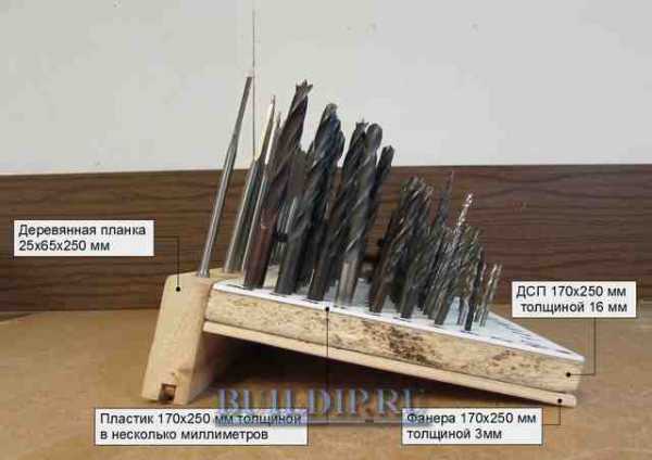 При работе дрелью приходится постоянно менять насадки. Часто бывает, что положите куда-нибудь сверло, а позднее его уже трудно найти. Смастерив своими руками небольшую подставку всего из четырех деталей, вы разместите в ней сверла, керны, карандаши, фрезы и другие аналогичные насадки.