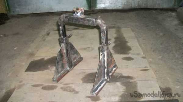 Далее были изготовлены индивидуальные пятки-опоры под конкретную машину. На четыре подставки — U-образные опоры под лонжероны. Материал — все та же водопроводная труба и фрагмент квадратного профиля 80х80: