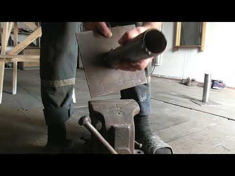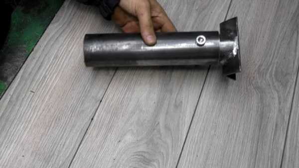 В качестве материала используем две трубы толщиной 57 и 48 мм. Стальная пластина. Мастер взял толщиной 8 мм. Отрезаем от каждой трубы по куску длиной 23 см. Можно применить хитрость для разметки трубы с помощью листа бумаги. На 57 на расстоянии 3 см от одного конца просверливаем отверстие (обе стенки трубы)