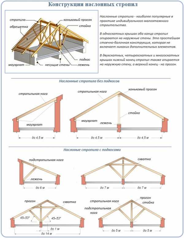 Рисунок 87. Стропильная система односкатной крыши (Схемы и элементы наслонных несущих деревянных стропил).