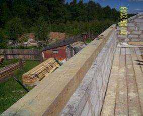 Если прогон проходит сквозь стену, то в месте опирания на стену, его тоже обматывают гидроизоляционным материалом. Балки пропускают сквозь стены из архитектурных соображений затем, чтобы обеспечить свес кровли над фронтонами, хотя его можно достичь и выносом за стену обрешетки.