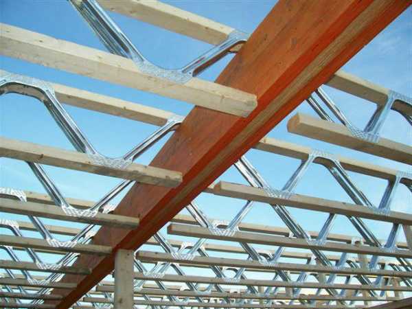Металлические накладки используются для упрочнения конструкции стропил в области конька