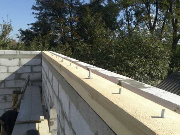 - Винтовые шпильки. В кладку внедряют арматуру по высоте минимум за 3 ряда до начала кровли. Размер арматуры — 10 мм. Шпильки, загнутые в Г-образную форму, связывают с арматурным каркасом. Длина шпильки подбирается так, чтобы оставшаяся над поверхностью стенового каркаса часть была на несколько сантиметров больше, чем толщина мауэрлата. Затем конструкцию заливают бетоном. В брусе мауэрлата сверлят ответные отверстия и надевают его на шпильки. Далее мауэрлат фиксируется гайками.