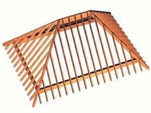 Вальмовые кровли также не оснащаются фронтонами. Две плоскости скатов такой крыши имеют вид трапеции, а остальные две — треугольника. Стропильные ноги в такой системе располагаются по диагонали. Образование скатов вальмовой кровли происходит за счет промежуточных стропил. Для их крепления используется мауэрлат и балки коньков. Расстояние между отдельными элементами при этом должно варьироваться в пределах 100-120 см.