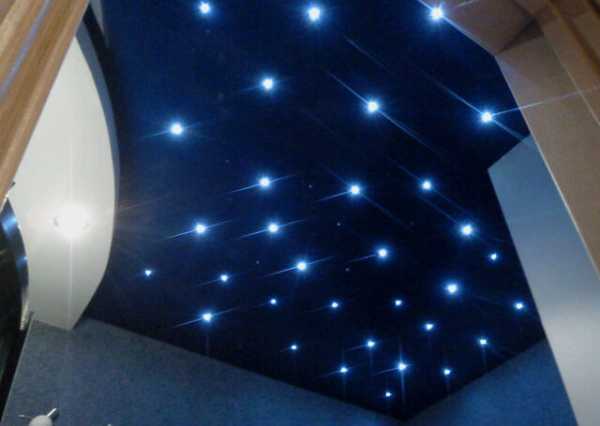 - Точечная подсветка. Таким способом можно организовать потолок с эффектом «звездное небо». Лампочки с подсветкой для потолка встраивают в отделочный материал. Такой тип подсветки считается самым трудоемким, так как для ее установки понадобится потратить значительно больше времени.