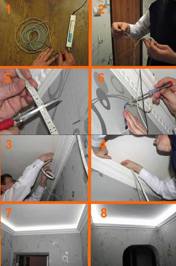 как установить диодную, светодиодную ленту для подсветки, монтаж потолочной ленточной подсветки, как сделать освещение по периметру своими руками