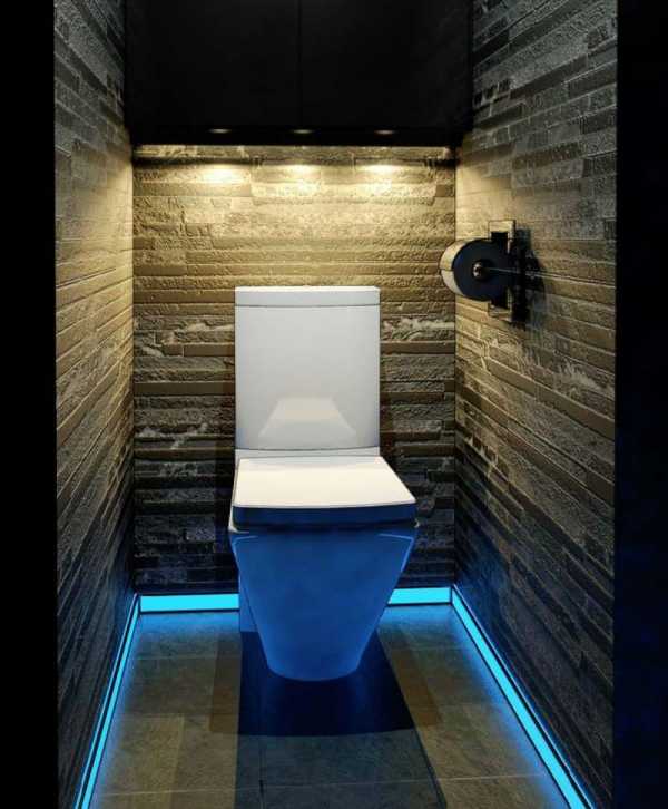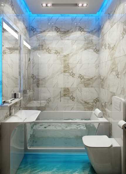 Интересным решением будет освещение пола в маленькой ванной комнате. Подойдут для ванной комнаты герметичные и прочные светильники, мощность которых не превышает 5 Вт. Именно такой источник освещения подходит для помещения с повышенной влажностью. Чтобы придать полу необычный световой эффект, можно воспользоваться цветными лампочками.