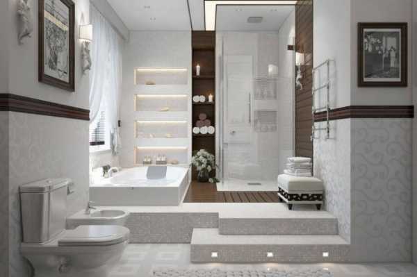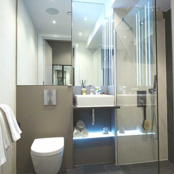 Зонирование используется в любом помещении, включая ванную комнату. Отдельной функциональной зоной можно сделать пространство вокруг зеркала. Если в небольшой ванной комнате есть подиум, ниша, дизайнеры рекомендуют осветить их максимально.