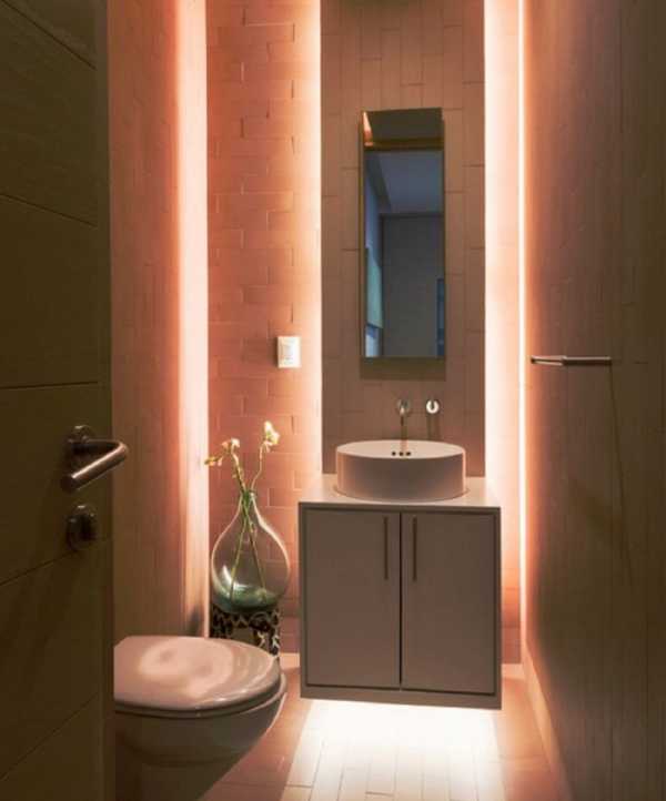 При продумывании освещения небольшой ванной комнаты, можно организовать подсветку мебели. Например, галогеновые лампы можно установить внутри шкафчика. При его открывании, вы легко найдёте все нужные предметы.