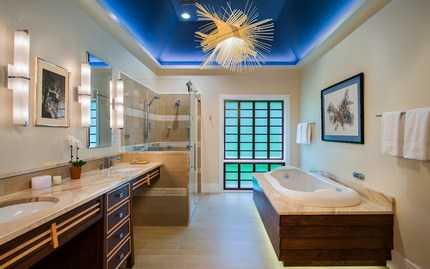 А вот этой роскошной ванной комнате дополнительное освещение, конечно, не помешает, тем более что здесь расположены живые растения, которым тоже нужен свет