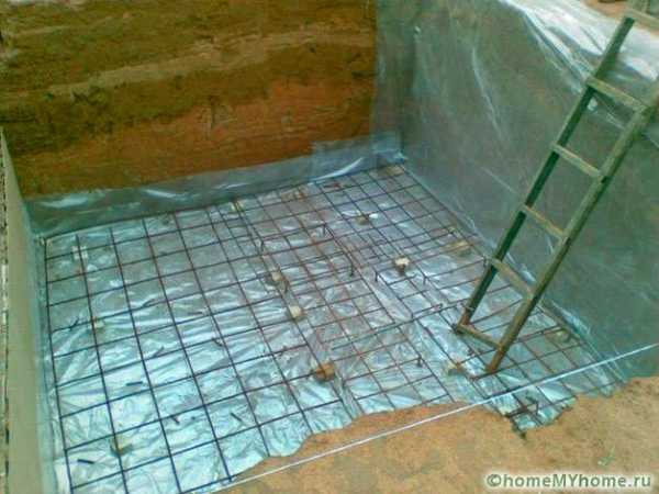 - Поверх материала (чаще всего это пленка из полиэтилена) укладываем арматурную решетку, полученное пространство заполняется бетоном, который разравнивается.