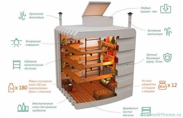 Оборудованное хранилище под домом (иными словами – погреб в погребе) удобно, так как всё находится рядом: зимой не нужно одеваться для выхода на улицу, как если бы он был отдельно размещён. Также вам не потребуется производить утепление стен, перекрытий, потому что такое помещение всегда держит плюсовую температуру.