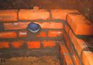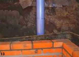 - После того как выполнено пару рядов кладки, нужно оставить нишу в стене для вентиляционной трубы: она будет выходить наверх. Сверху ее следует прикрыть решеткой, чтобы внутрь не проникли грызуны.