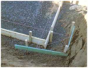 - Производим заливку бетона. Раствор готовим в пропорции 1:3:5 (цемент/песок/гравий) или покупаем товарный бетон (предпочтительнее и качественнее). Бетон разравниваем с помощью виброрейки, опалубку заполняем до краев;