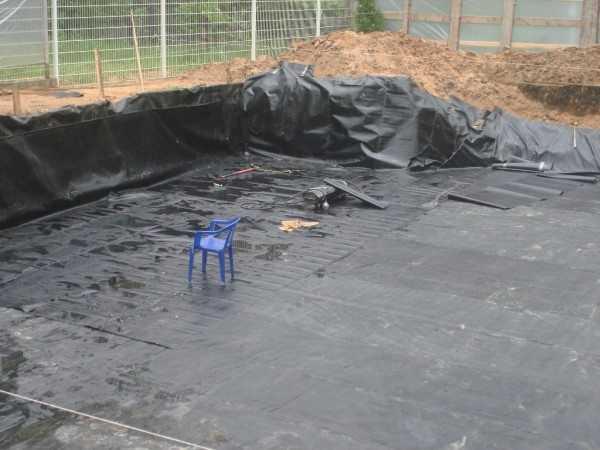 - На подсыпку из гравия и песка стелем строительный полиэтилен в два слоя. Толщина пленки – не менее 300 мкм. Делаем нахлесты на стены высотой не менее 35 см;