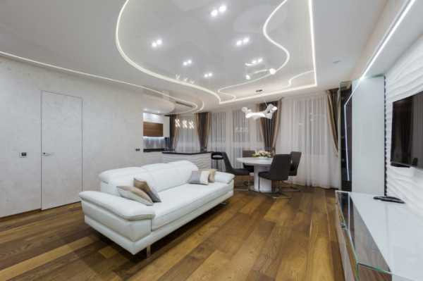 В двухуровневый потолок лучше провести светодиодную ленту для элегантного освещения. Плюсом является то, что такой потолок не только приукрасит гостиную, но и скроет все изъяны. Доверить монтаж лучше профессионалам, так как необходимы специальные инструменты и газовая пушка.