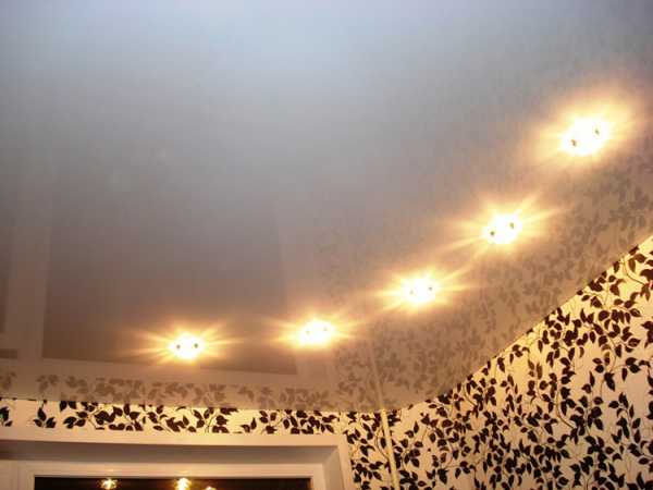 Для натяжных конструкций существуют специальные встраиваемые точечные светильники. Они различаются по способу фиксации и типу ламп. Энергосберегающая лампа — наиболее приемлемая. Она не накаляется, поэтому не деформирует полотно.